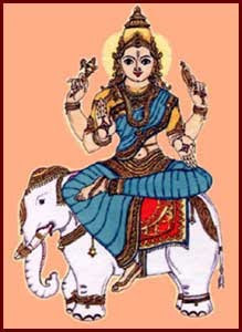 Aindri, (Sanskrit: ऐन्द्री, Aindrī) also known as Indrani (Sanskrit: इन्द्राणी, Indrāṇī), Mahendri, Shakri and Vajri, is the power of the Indra, the Lord of the heaven. Seated on a charging elephant, Aindri, is depicted dark-skinned, with two or four or six arms. She is depicted as having two or three or like Indra, a thousand eyes. She is armed with the Vajra (thunderbolt), goad, noose and lotus stalk. Adorned with variety of ornaments, she wears the kiriṭa mukuṭa.